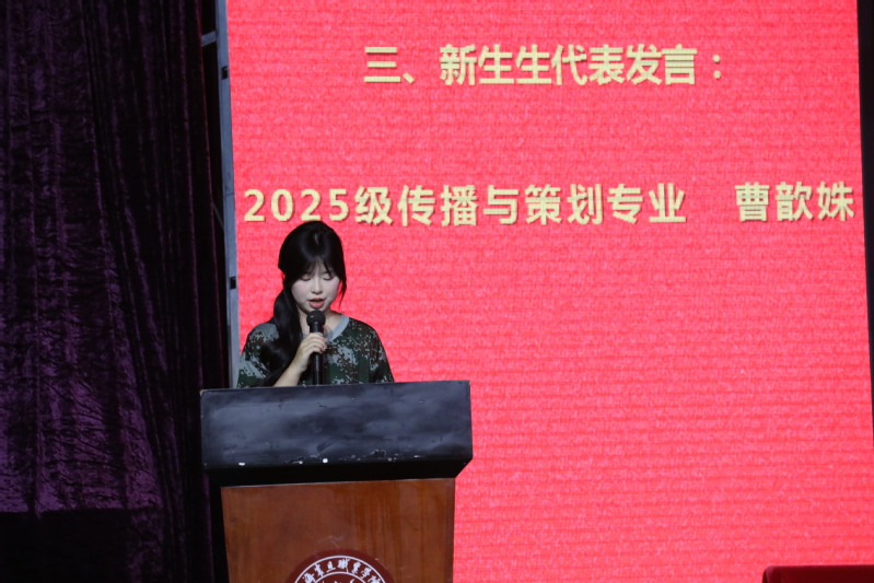2025級(jí)傳播與策劃專業(yè)曹歆姝同學(xué)代表全體新生發(fā)言,表達(dá)了對(duì)未來(lái)的憧憬、對(duì)大學(xué)生活的期待和刻苦努力的決心,表示將不負(fù)眾望,為學(xué)院爭(zhēng)光添彩。