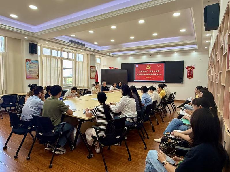 2025年9月12日下午13:00,經(jīng)濟(jì)管理學(xué)院召開教職員工師德師風(fēng)大會暨新學(xué)期教師工作會議,學(xué)院院長胡守忠、副院長曹鳳蘭及全體教師參會,會議由學(xué)院黨總支書記鹿群主持。